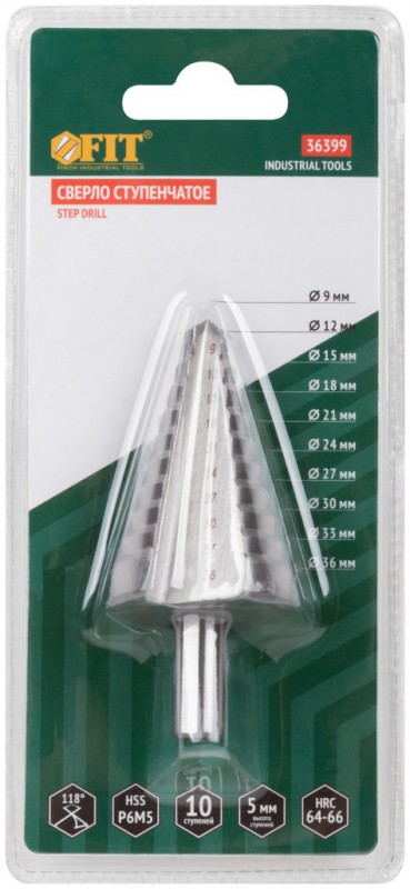 Сверло ступенчатое HSS (Р6М5) по металлу, 9-36 мм FIT 36399