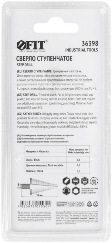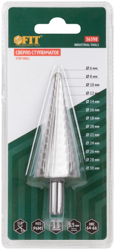 Сверло ступенчатое HSS (Р6М5) по металлу, 6-30 мм FIT 36398