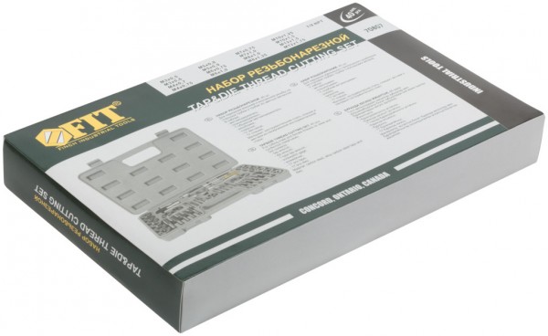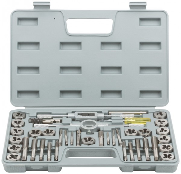В наборе: 2 метчикодержателя, плашкодержатель 1”, резьбомер, отвертка, 17 метчиков и 17 плашек.
